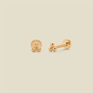 This contemporary favorite features 3 tiny beads for a versatile look that never stops serving. Each petite, solid gold earring features a smooth, flat back that inserts through the back of your piercing and an earring top that screws in for a 24/7 secure and comfortable fit. Live loudly and sleep soundly when you reimagine your routine in earrings made to support your story.