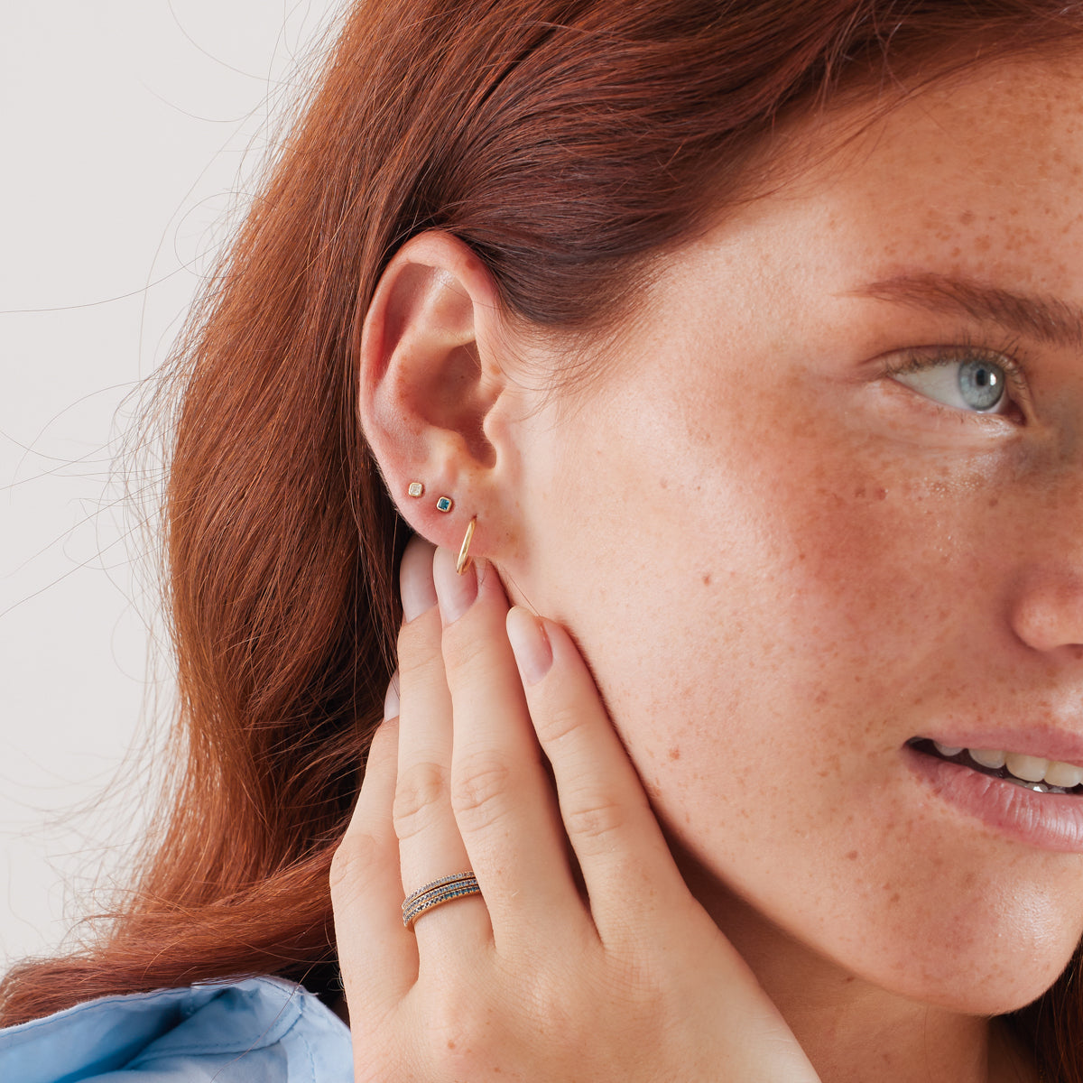 This squared Asscher cut diamond CZ birthstone, a symbol of love, is bezel-set in gold vermeil for a minimalist pop of color. Comfortable and captivating, this pair features a shorter post length and a screw-on ball-style back for lightweight, long-term wear. Exchange the snags and pokes of traditional earring backs for a style that is cartilage and lobe friendly, headphone ready, and nap approved.