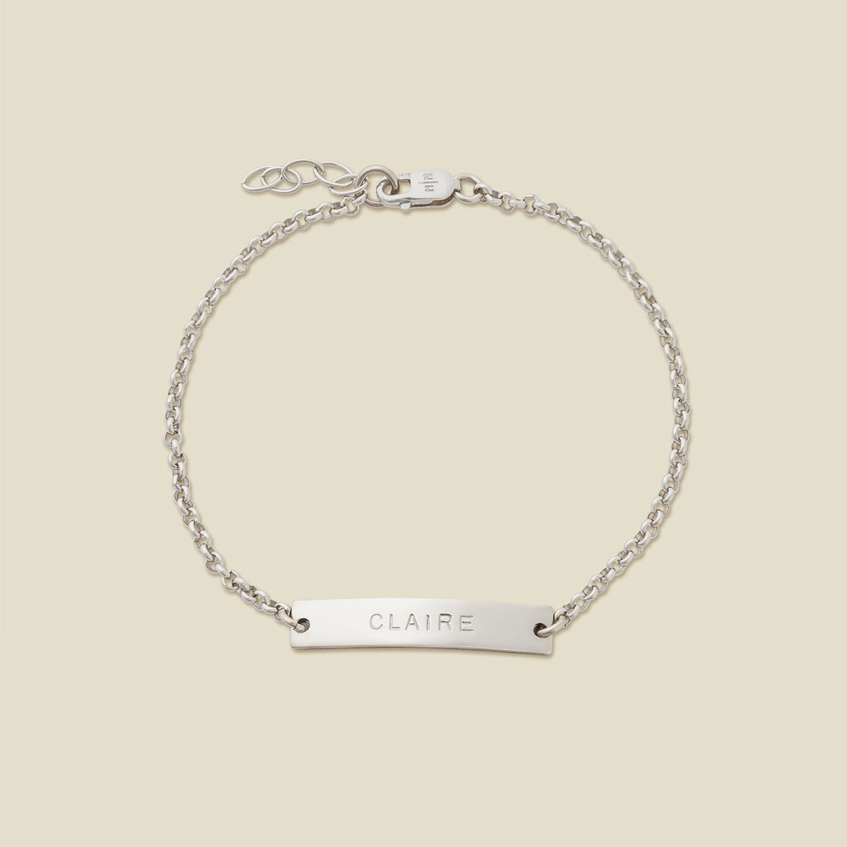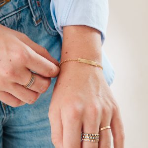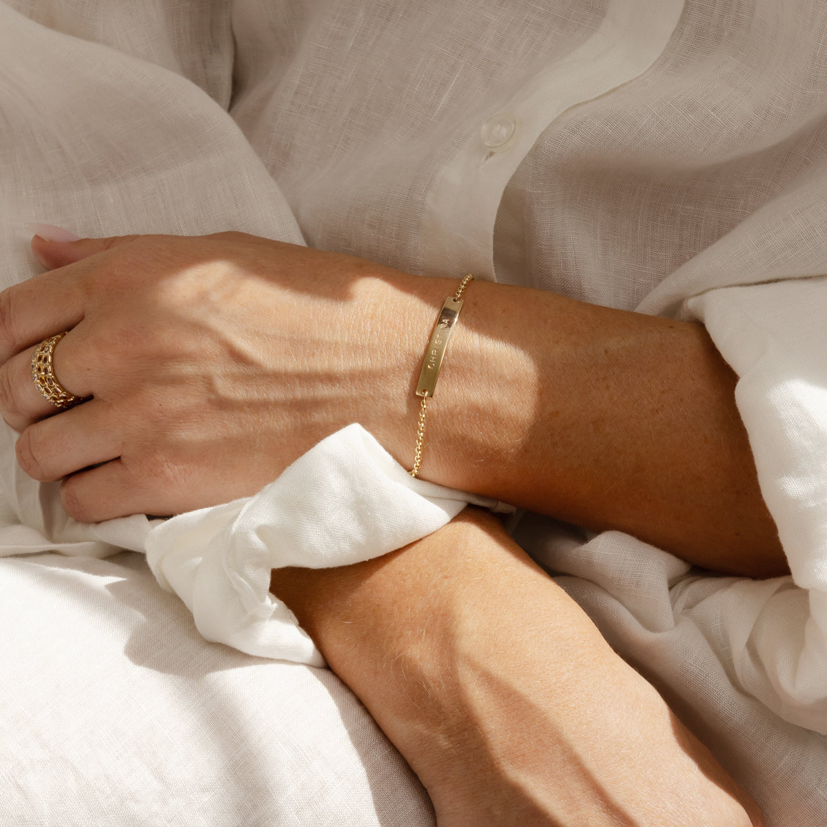 Minimal, modern, and masterfully made, our Horizontal Bar Bracelet really is the polished piece you’ve been craving. Each individual 1″ or 1.25” bar is hand-cut, filed, and finished with next-level craftsmanship. Make it your own with up to 9 characters, customized to your specifications and expertly stamped for a piece as uniquely stunning as you. The text for each bar slightly varies, the 1.0″ bar will be stamped with a centered placement and right-aligned on the 1.25″ bar.