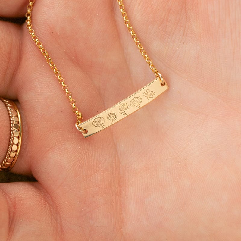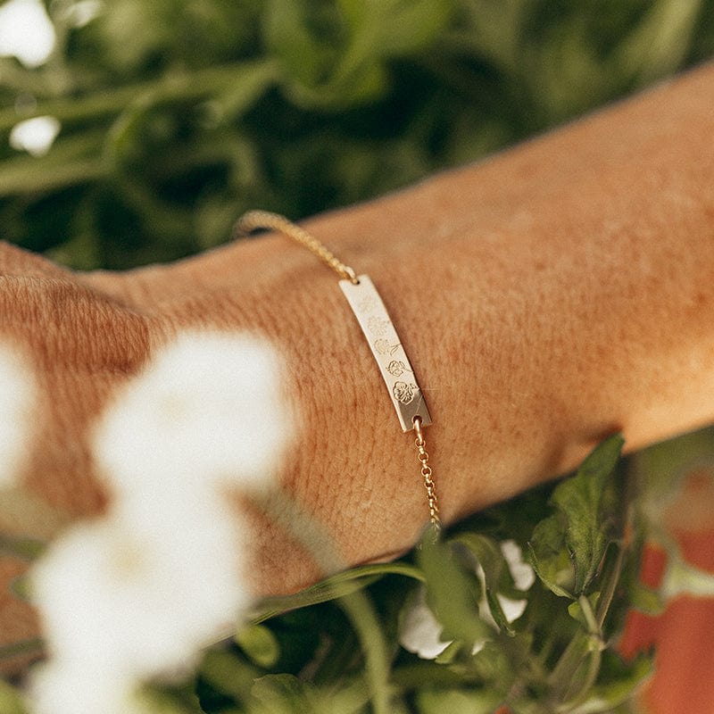 Featuring our best-selling, hand-drawn designs from our Birth Flower Collection. Our Birth Flower Bar Bracelet allows you to add up to 5 birth flowers to keep all those you love right on your wrist.