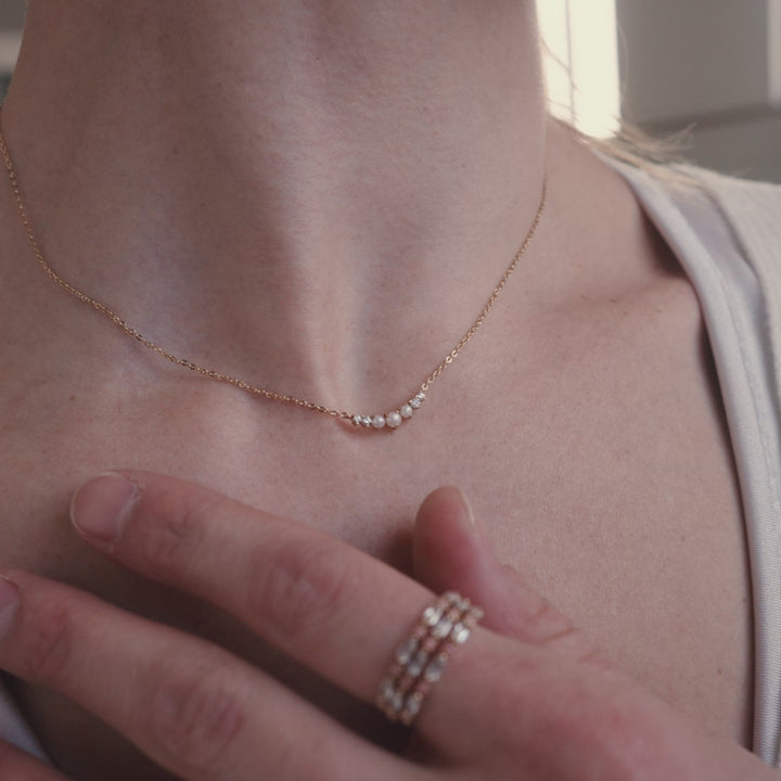 Beautifully understated, this necklace features a fixed crescent of graduated freshwater pearls, accented by the sparkle of petite CZs. See yourself reflected in the stunning silhouette of this luminous layer.