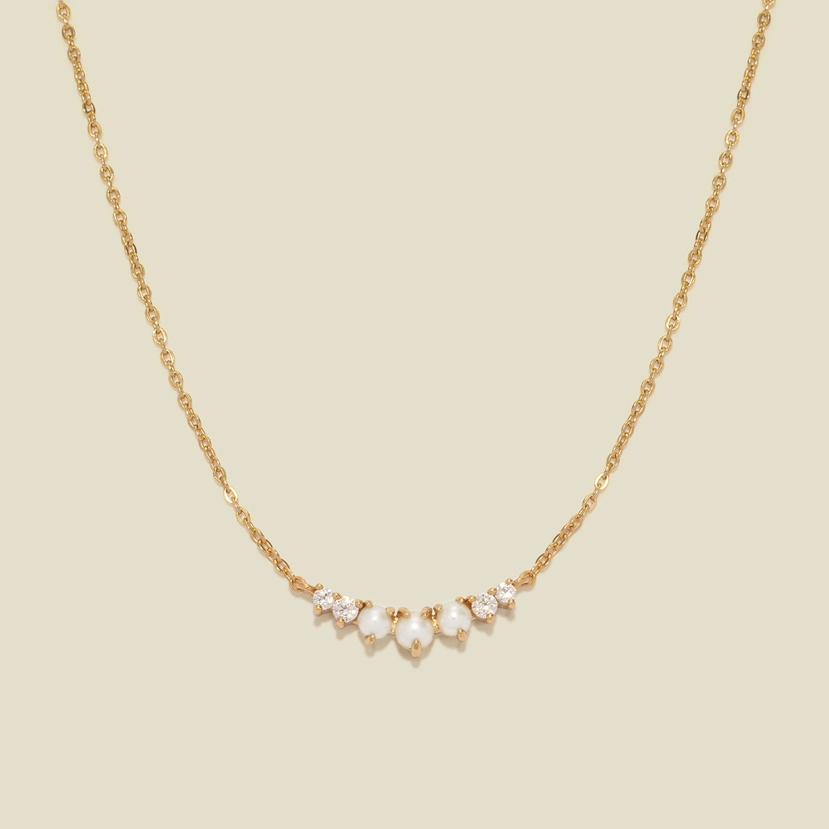 Beautifully understated, this necklace features a fixed crescent of graduated freshwater pearls, accented by the sparkle of petite CZs. See yourself reflected in the stunning silhouette of this luminous layer.