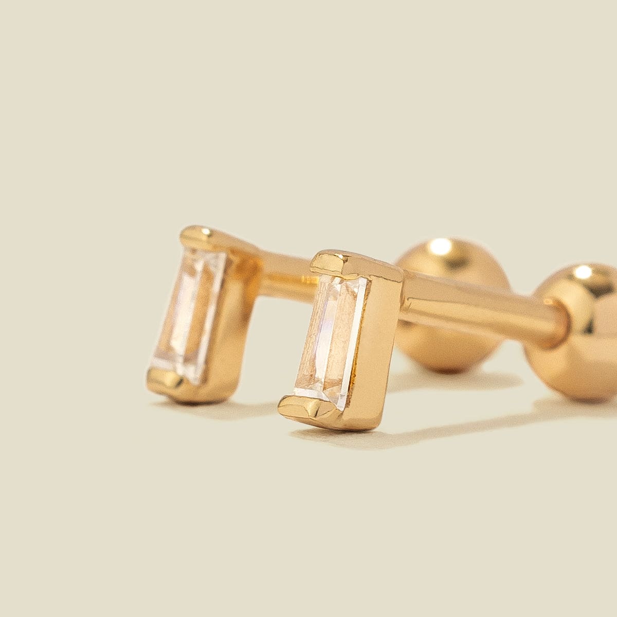 Featuring a sparkling prong-set baguette CZ, this pair of crystalline earrings give a little elevation to the everyday. Each lightweight stud features a shorter post length and a screw-on ball-style back for comfortable long-term wear. Exchange the snags and pokes of traditional earring backs for a style that is cartilage and lobe friendly, headphone ready, and nap approved.