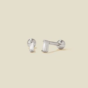 Featuring a sparkling prong-set baguette CZ, this pair of crystalline earrings give a little elevation to the everyday. Each lightweight stud features a shorter post length and a screw-on ball-style back for comfortable long-term wear. Exchange the snags and pokes of traditional earring backs for a style that is cartilage and lobe friendly, headphone ready, and nap approved.