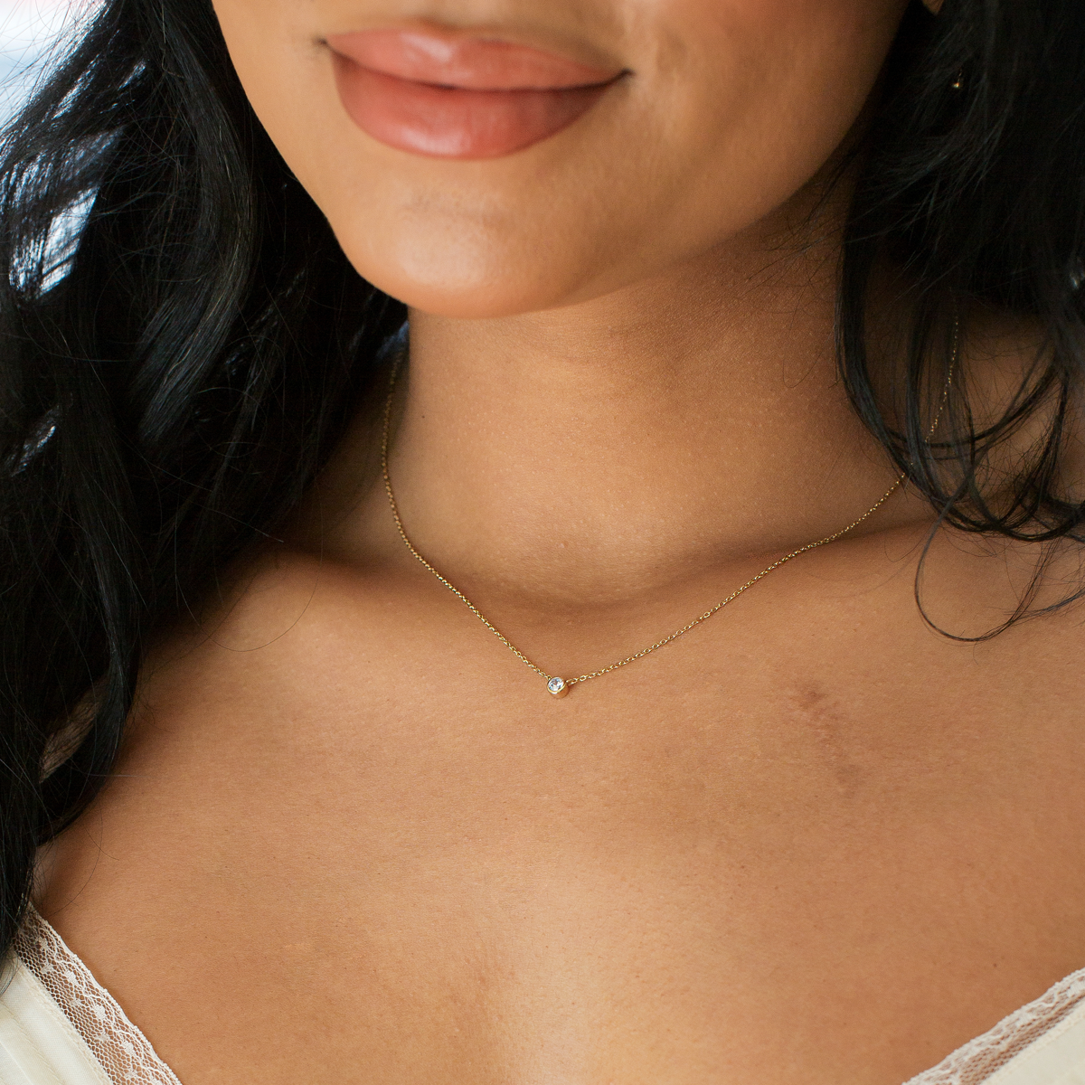 Proof that one sparkle is all you need. Featuring a single bezel-set CZ on a dainty gold chain, this necklace brings easy elegance to your layered look or makes a sweet standalone statement. Timeless, personal, effortless.
