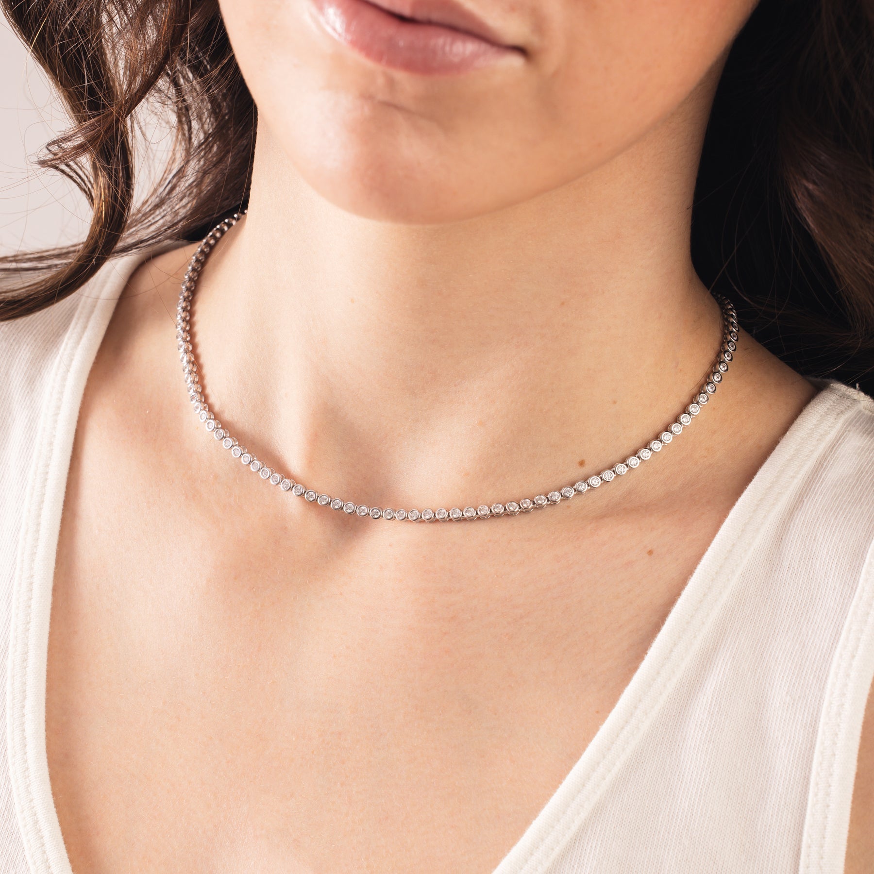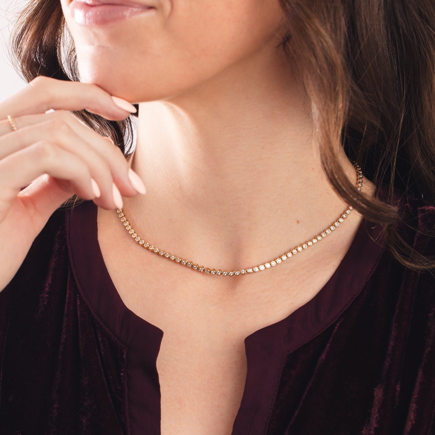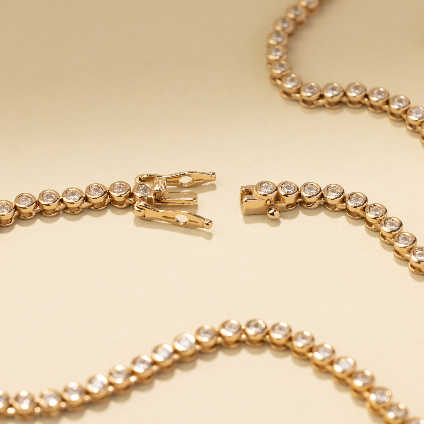 Serve up a statement in this luxurious, luminous layer. Featuring sparkling bezel-set CZs in a continuous line, each gold or silver chain has an open box clasp for an elevated finish. Claim the accessory advantage with a bold necklace that is party perfected- and just as irresistible with jeans and a tee.