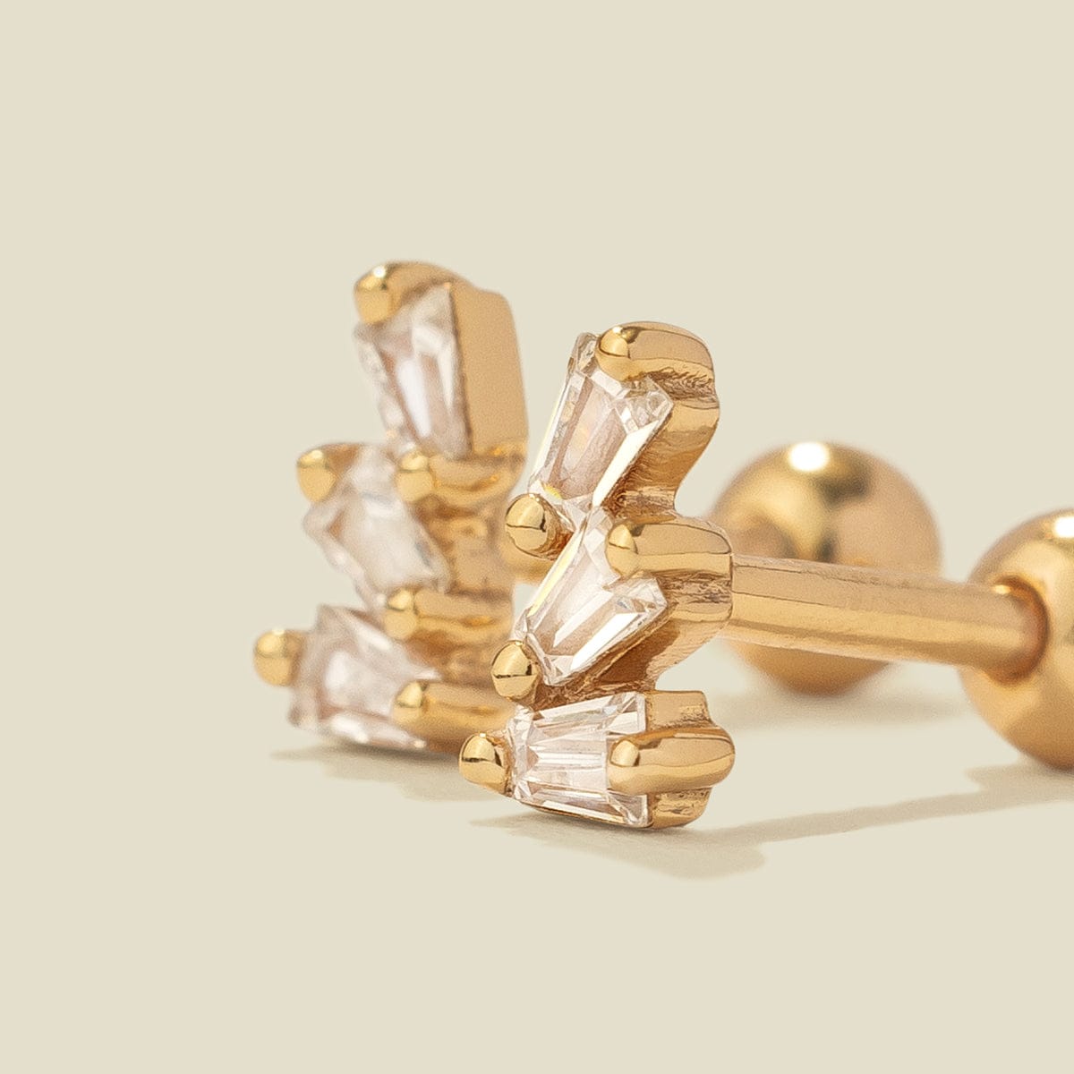 Polished and captivating, these triple baguette CZ studs evoke a sparkling ice fall for a shimmery finish. Each lightweight prong-set stud features a shorter post length and a screw-on ball-style back for easy, breezy long-term wear. Exchange the snags and pokes of traditional earring backs for a style that is cartilage and lobe friendly, headphone ready, and nap approved.