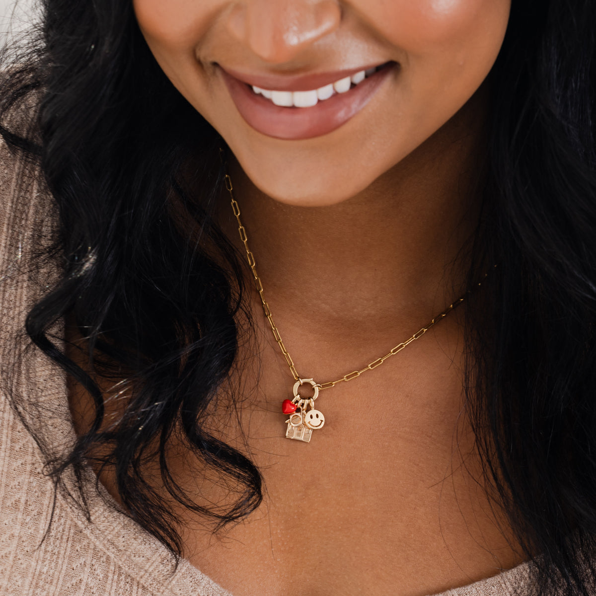 A fullmhouse is a fullmheart. This complete collection of the Heart Charm, Soda Tab Charm, House Charm, and Smiley Face Charm on a Jude Charm Necklace has all the ingredients for a celebration of comfort and connection. Wear them all together or customize your look with a quick click to create your own meaningful combos.