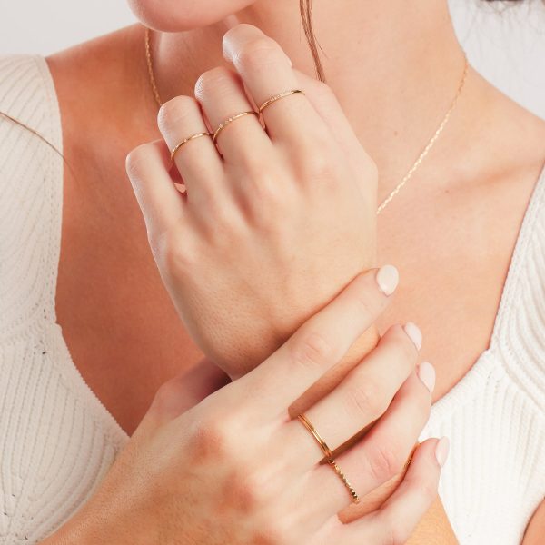 You own the night; take a walk among the stars in the Stella Diamond Ring. Reminiscent of stardust, this 14k solid gold ring features a petite and stackable band encircled with 5 single cut round diamonds. Catch the glow and bask in the radiance to a piece designed to showcase your stunning potential in the most delicate detail.