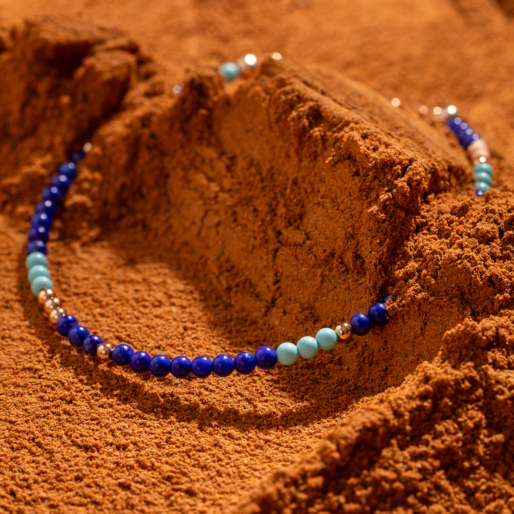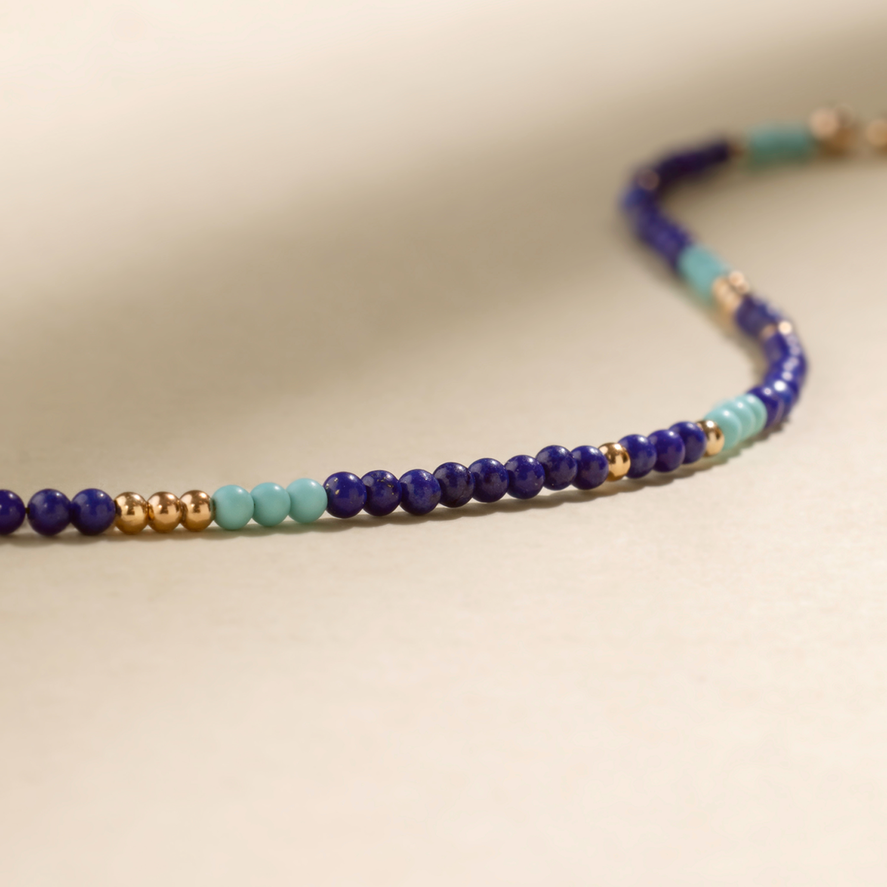 A delicate strand of turquoise and lapis beads, representing calm, connection, and a touch of intuition. These true blue hues are versatile and easy to wear- layer it up or let it shine solo.