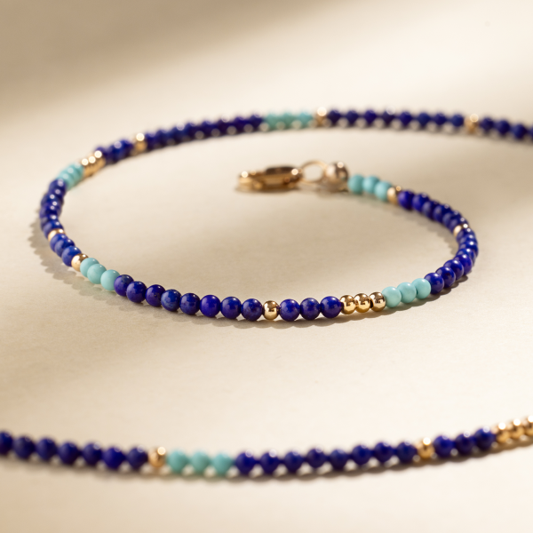 Vibrant turquoise and deep lapis, strung together for a delicate blue touch. Known for their grounding energy and intuitive connection, these stones bring a sense of clarity and calm. Lightweight and easy to layer, with just the right pop of color to truly stand out.