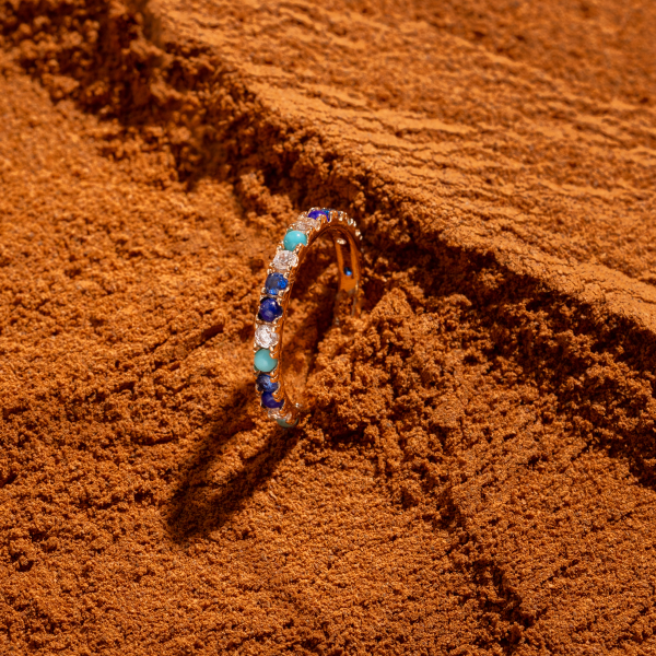 Turquoise, lapis, and sparkling CZ- a bold trio of color, stones chosen for their vibrant look and energy. Known for enhancing self-expression and inner clarity, these stones are a reminder to stay true to yourself. Wear it alone or stack it up for a bold blue, layered look.